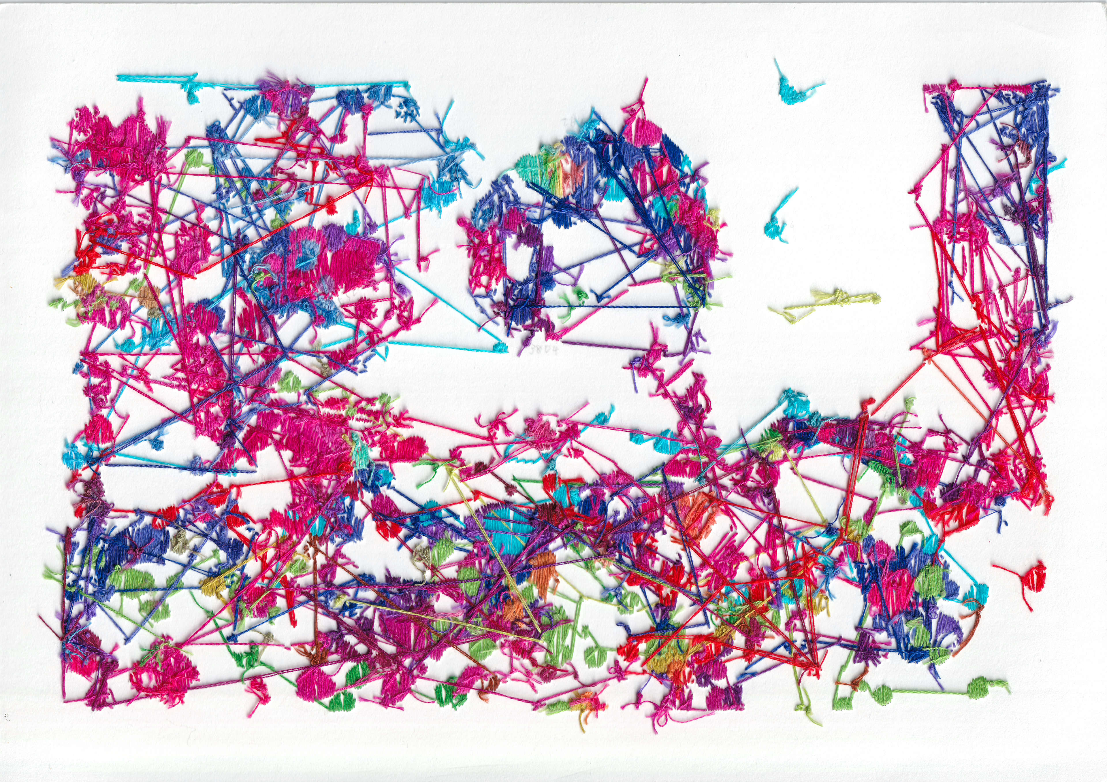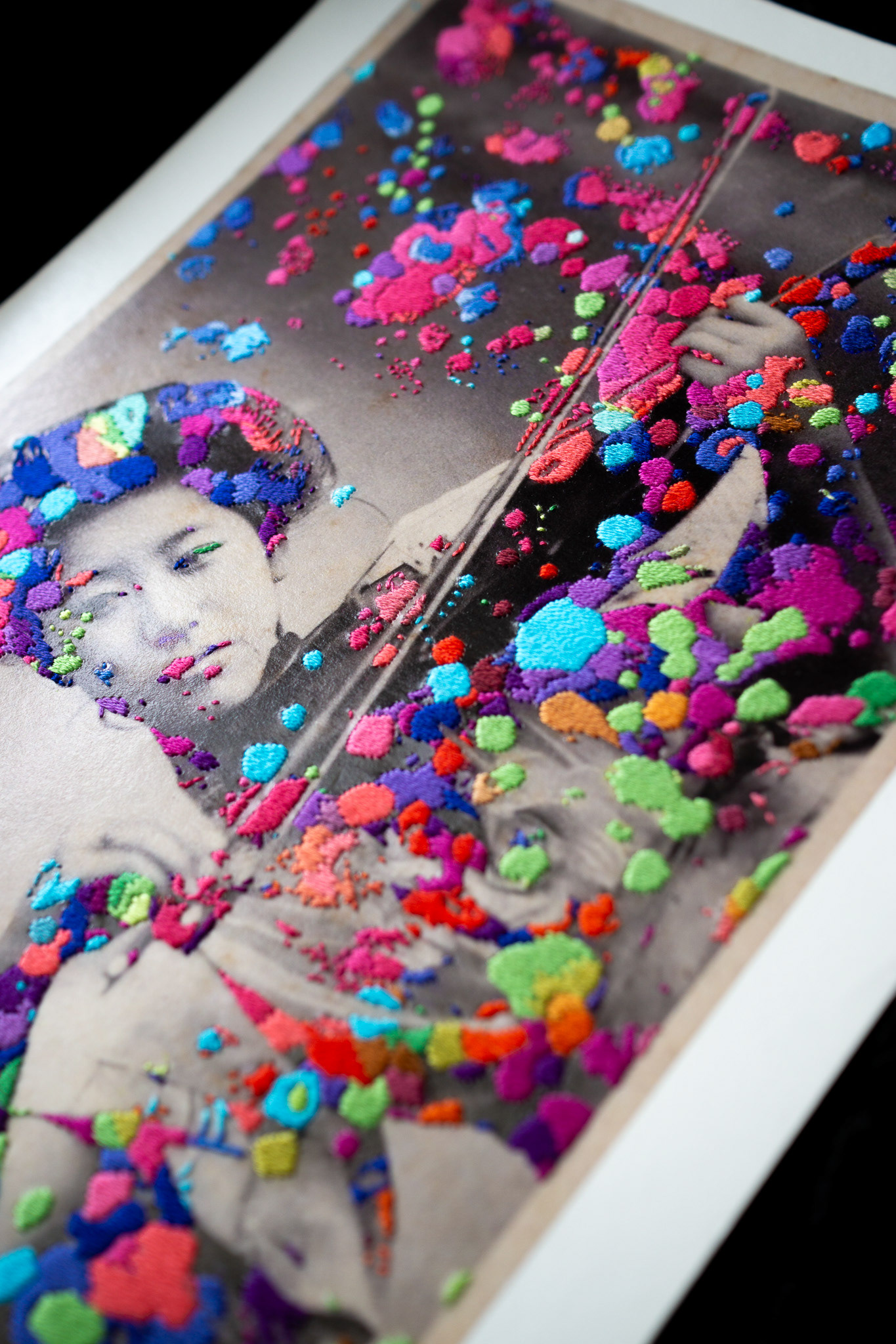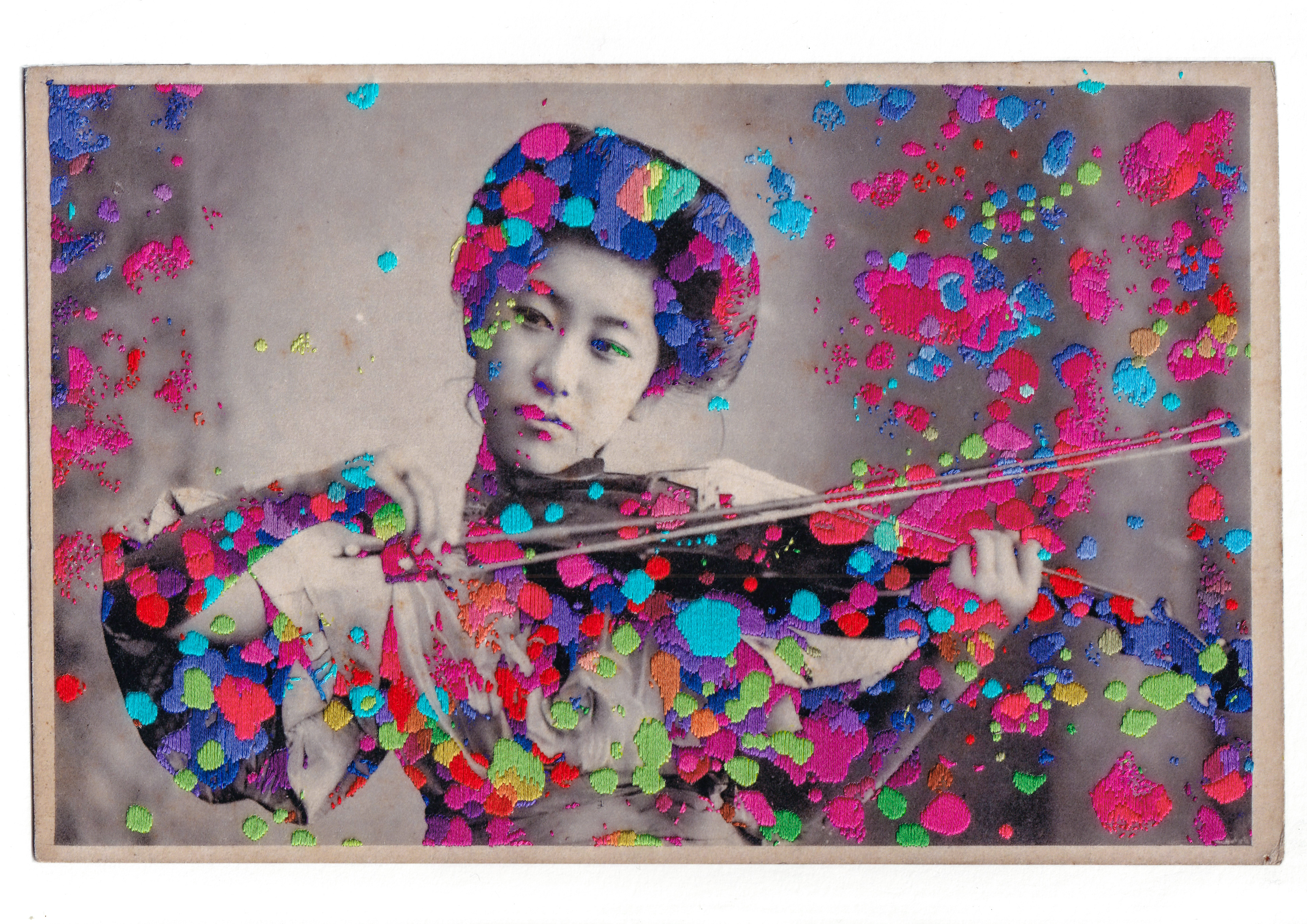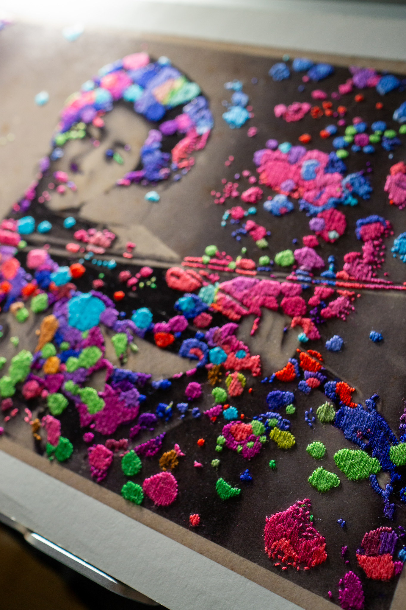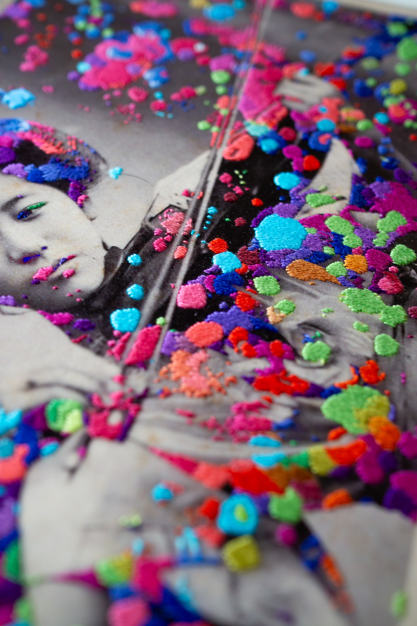 Hand embroidery directly on Giclée print - "Love Is Noise, 2022"