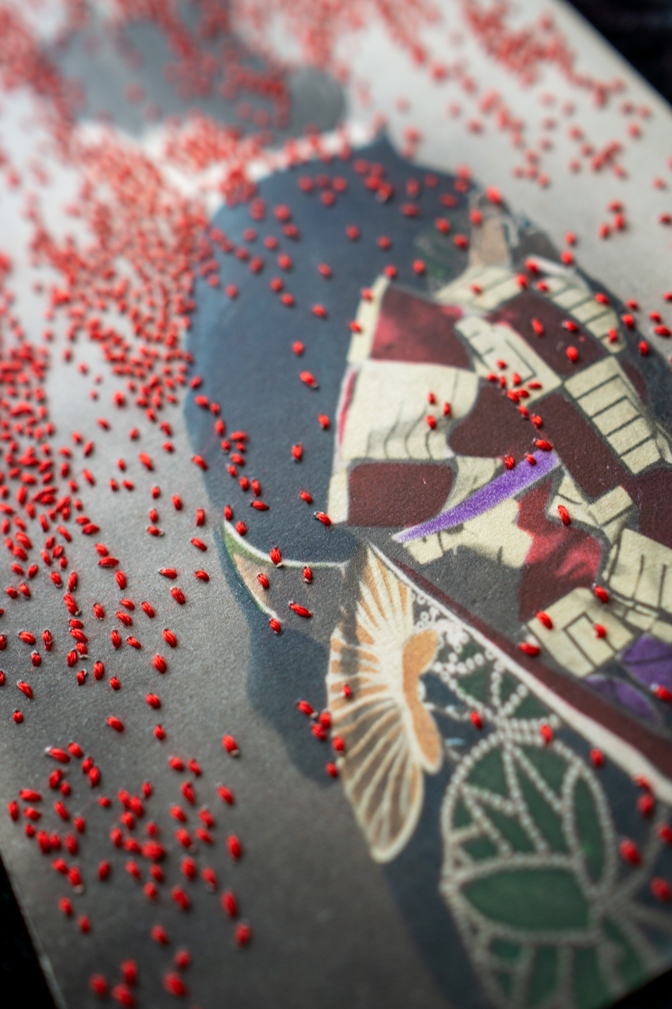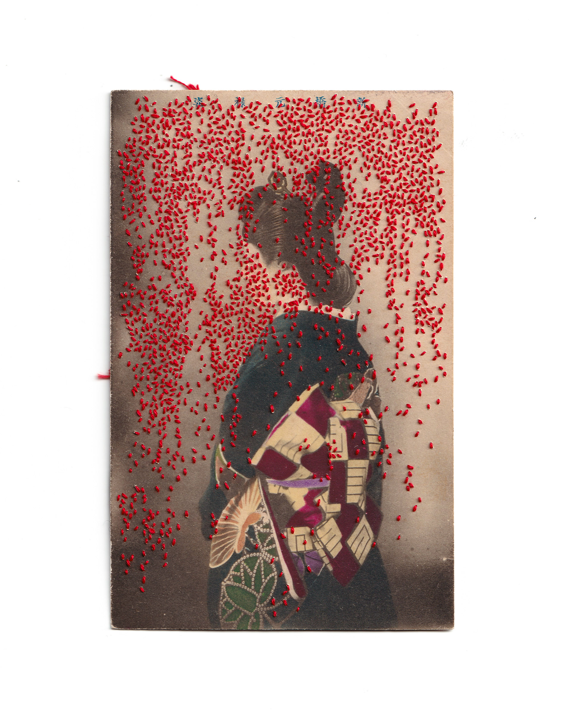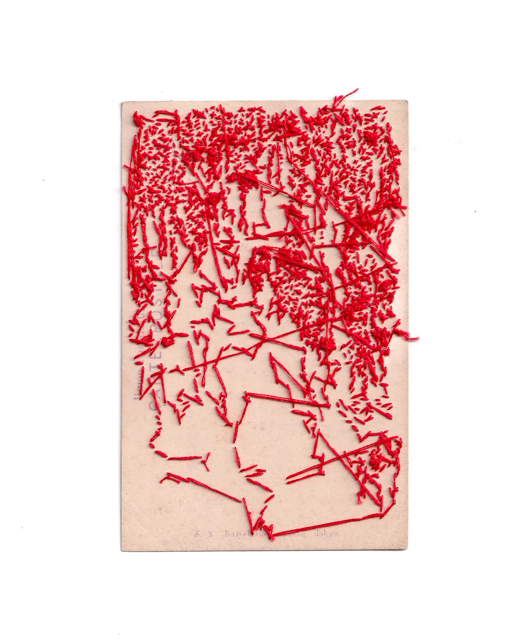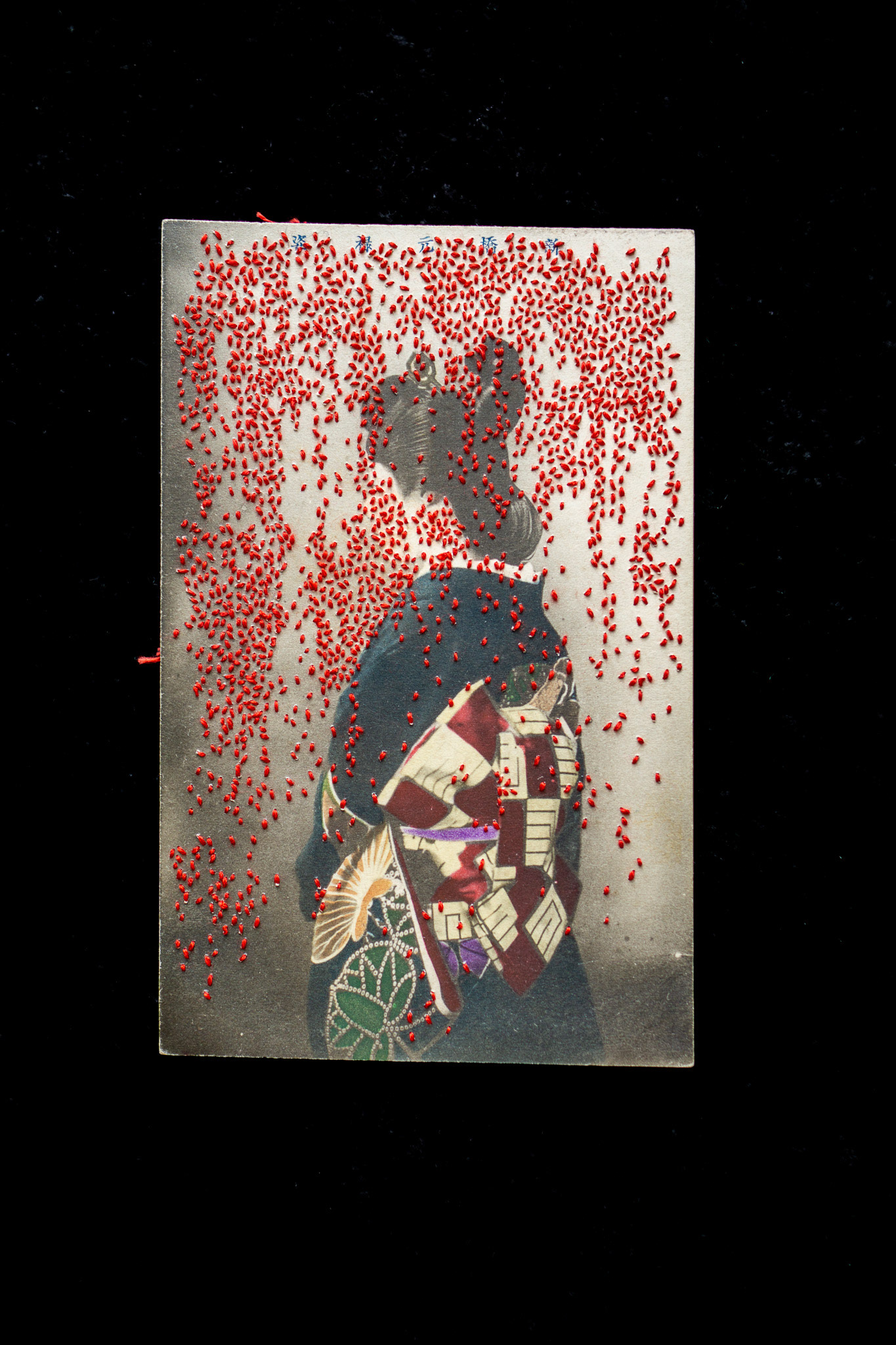 Hand embroidery directly on a vintage hand-colored postcard