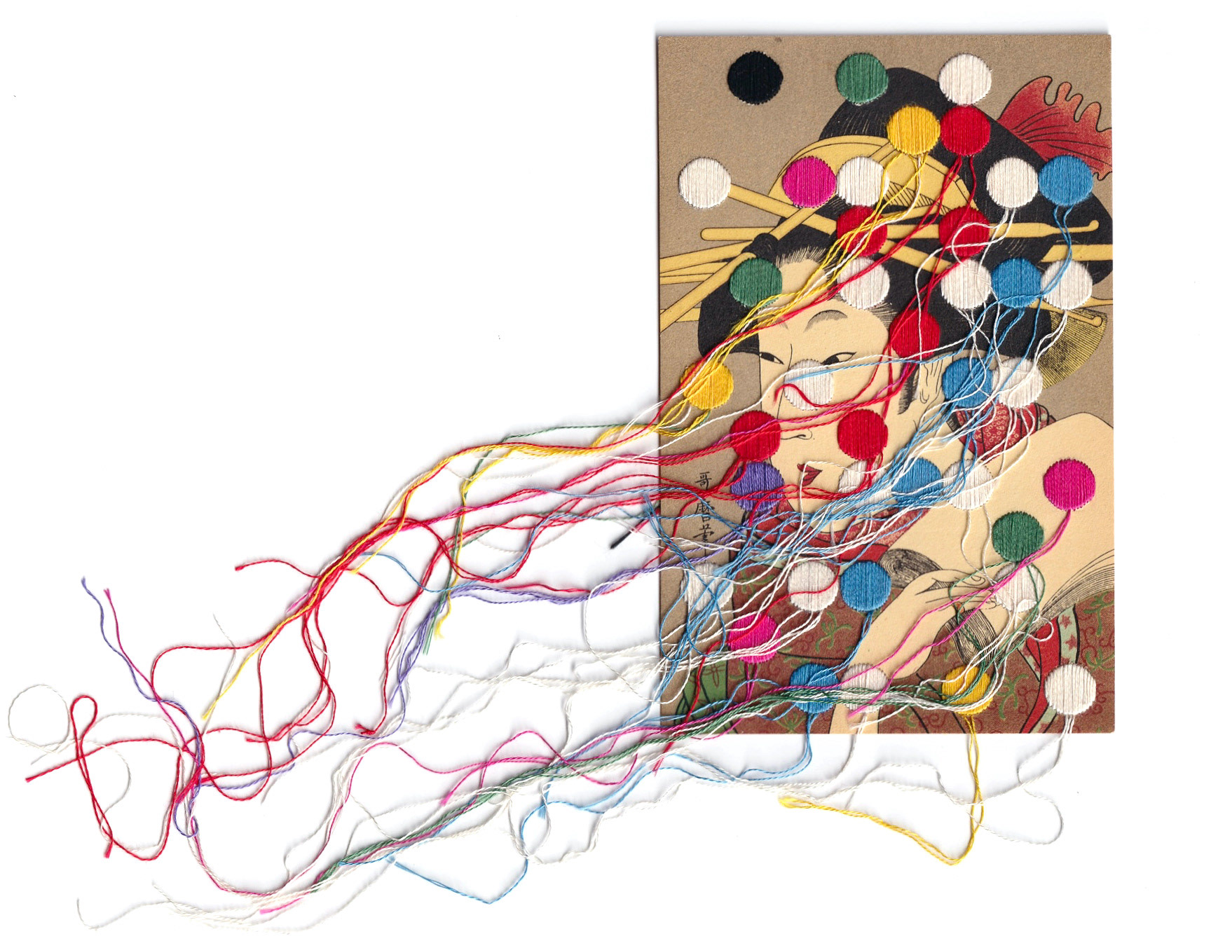 " This Ukiyo-e postcard is a bit damaged, but I like to use this kind of material. I've always chosen old unsold materials that have been forgotten, have not yet found a home, or have lost their homes. I was hesitant to sew on "art" because I thought it would be rude, but if it is going to be forgotten and thrown away, there’s nothing but to do it. And I guess if I were an ukiyo-e artist, I'd tell me to Do It! Welcome to 2021. Thanks to all Ukiyo-e artists and to everyone who welcomes this kind of work."